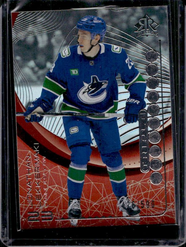 The Jonathan Lekkerimaki 2024 Upper Deck Extended Series #TDR-15 Triple Dimensions Reflections - Ruby /500 Rookie card is 1 of 69 Jonathan Lekkerimaki's card variations in the 2024 Upper Deck Extended Series set being tracked by Sports Card Investor, including #745 Base, #706 Base, #706 Young Guns Base, #745 Clear Cut, and #706 Clear Cut.
