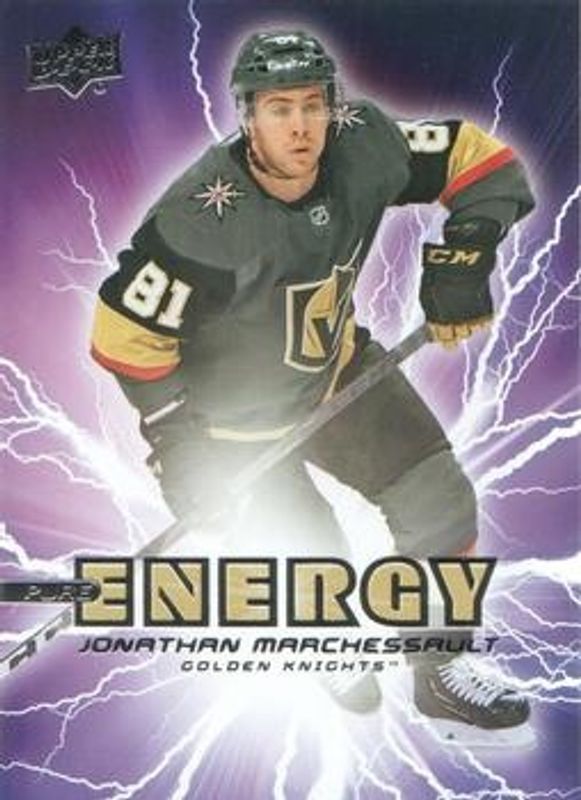 The Jonathan Marchessault 2019 Upper Deck #PE-11 Pure Energy card is 1 of 14 Jonathan Marchessault's card variations in the 2019 Upper Deck set being tracked by Sports Card Investor, including Base, Clear Cut, UD Exclusives Clear Cut, UD Exclusives /100, and UD High Gloss /10.