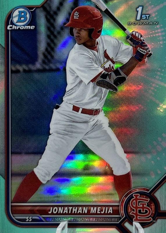 This card is 1 of 47 Jonathan Mejia's card variations in the 2022 Bowman Chrome set being tracked by Sports Card Investor, including Prospects (1st), Prospects - Black & White Mini-Diamond Refractor (1st), Prospects - Shimmer Refractor (1st), Prospects - Refractor /499 (1st), and Prospects - Speckle Refractor /299 (1st).