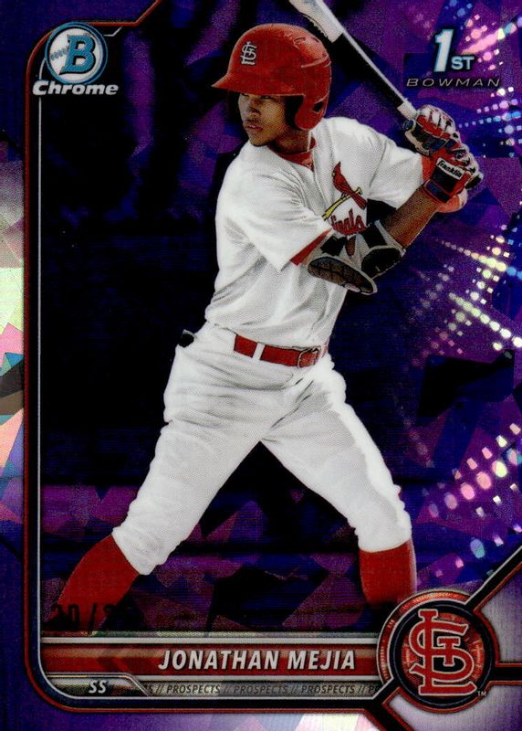 This card is 1 of 7 Jonathan Mejia's card variations in the 2022 Bowman Chrome Sapphire Edition set being tracked by Sports Card Investor, including Prospects (1st), Prospects - Aqua /99 (1st), Prospects - Orange /75 (1st), Prospects - Yellow /50 (1st), and Prospects - Red /5 (1st).