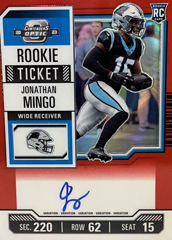 This card is 1 of 46 Jonathan Mingo's card variations in the 2023 Contenders Optic set being tracked by Sports Card Investor, including Rookie of the Year Contenders Autographs (/99), Rookie of the Year Contenders Autographs - Blue (/75), Rookie Ticket Auto, Rookie Ticket Auto - Red (/175), and Rookie Ticket Auto - Silver.