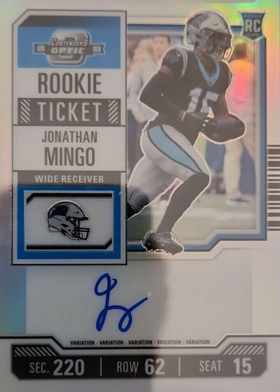 This card is 1 of 46 Jonathan Mingo's card variations in the 2023 Contenders Optic set being tracked by Sports Card Investor, including Rookie of the Year Contenders Autographs (/99), Rookie of the Year Contenders Autographs - Blue (/75), Rookie Ticket Auto, Rookie Ticket Auto - Red (/175), and Rookie Ticket Auto - Silver.