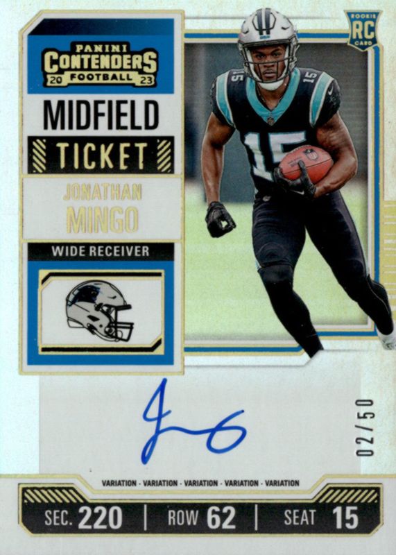 The Jonathan Mingo 2023 Contenders #119 Rookie Ticket Auto Variation - Midfield Ticket /50 card in Raw condition has not changed in price in the last 30 days and was last sold for $7.50 .