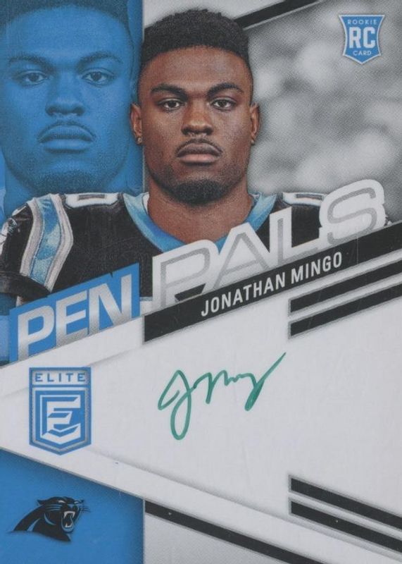 This card is 1 of 13 Jonathan Mingo's card variations in the 2023 Elite set being tracked by Sports Card Investor, including Pen Pals, Pen Pals - Black Gold Ink, Pen Pals - Blue Ink, Pen Pals - Purple Ink, and Pen Pals - Red Ink.