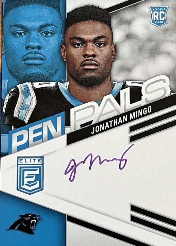 This card is 1 of 13 Jonathan Mingo's card variations in the 2023 Elite set being tracked by Sports Card Investor, including Pen Pals, Pen Pals - Black Gold Ink, Pen Pals - Blue Ink, Pen Pals - Green Ink, and Pen Pals - Red Ink.