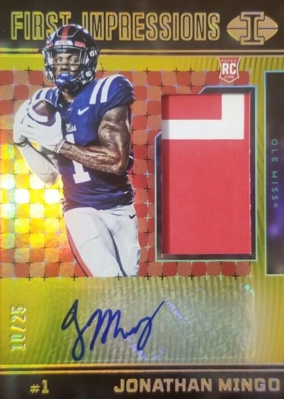 This card is 1 of 10 Jonathan Mingo's card variations in the 2023 Illusions set being tracked by Sports Card Investor, including First Impressions Memorabilia Autographs /399, First Impressions Memorabilia Autographs - Red /199, First Impressions Memorabilia Autographs - Blue /99, First Impressions Memorabilia Autographs - Black /50, and First Impressions Memorabilia Autographs - Black Ice FOTL /50.