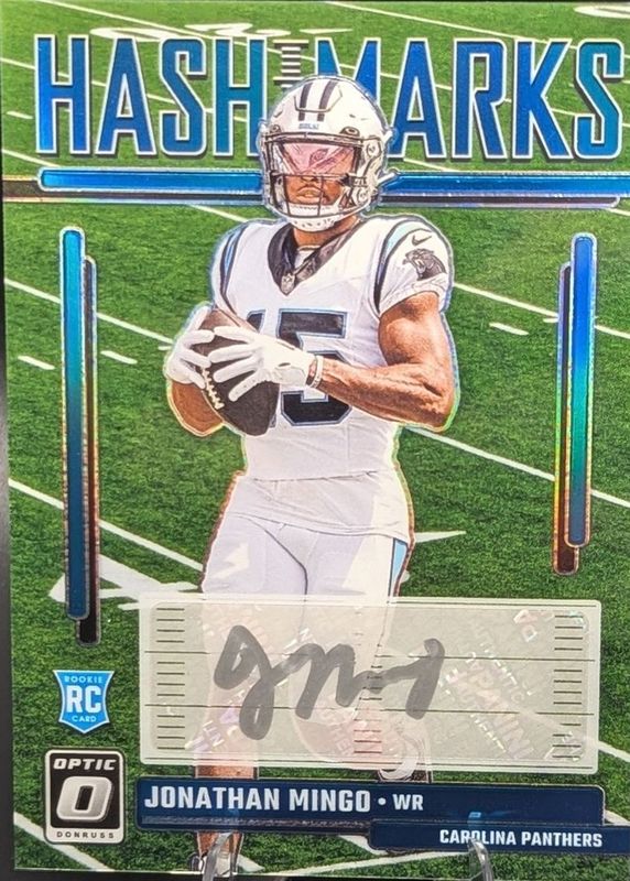 The Jonathan Mingo 2023 Optic #HM-29 Hash Marks Autographs Rookie card in Raw condition has not changed in price in the last 30 days and was last sold for $4.99 .