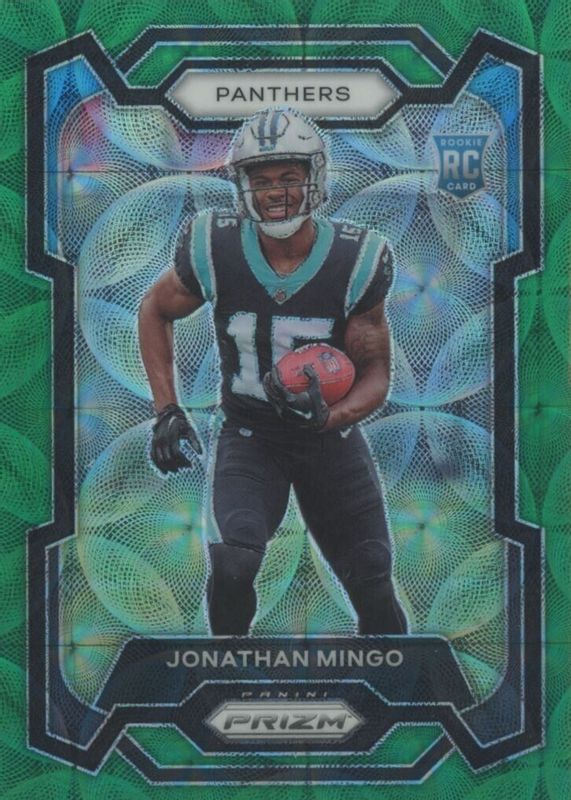 This card is 1 of 77 Jonathan Mingo's card variations in the 2023 Prizm set being tracked by Sports Card Investor, including Base, Disco, Green, Green Ice, and Green Wave.