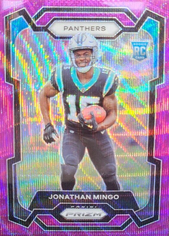 This card is 1 of 77 Jonathan Mingo's card variations in the 2023 Prizm set being tracked by Sports Card Investor, including Base, Disco, Green, Green Ice, and Green Wave.