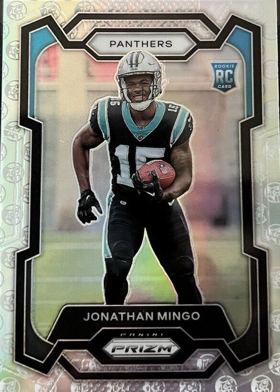 This card is 1 of 77 Jonathan Mingo's card variations in the 2023 Prizm set being tracked by Sports Card Investor, including Base, Disco, Green, Green Ice, and Green Wave.