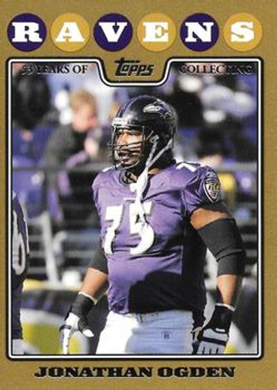 The Jonathan Ogden 2008 Topps #280 Gold /2008 card is 1 of 9 Jonathan Ogden's card variations in the 2008 Topps set being tracked by Sports Card Investor, including Base, Gold Foil, Black /53, Platinum /1, and Printing Plates Black /1.