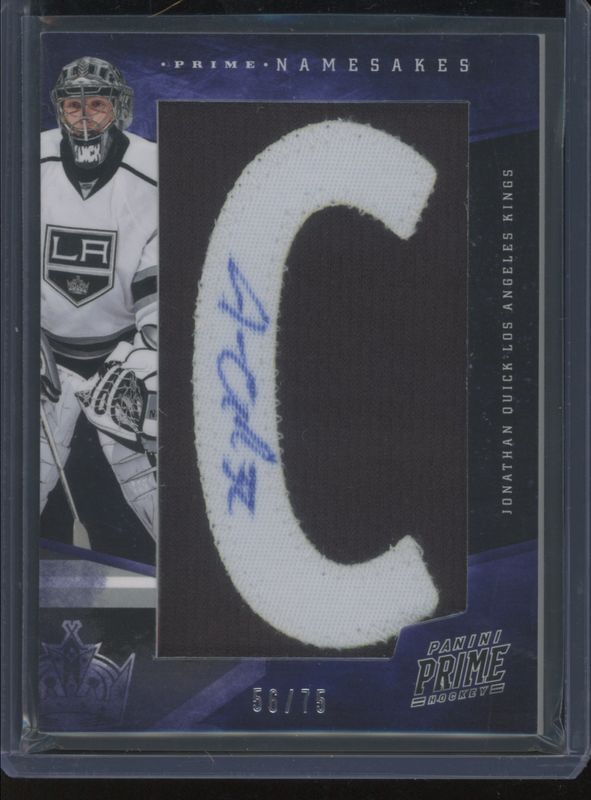 The Jonathan Quick 2011 Prime #42c Prime Namesakes /50 card is 1 of 17 Jonathan Quick's card variations in the 2011 Prime set being tracked by Sports Card Investor, including Base /199, Silver /25, Gold /5, Black /1, and Black Autographed /1.