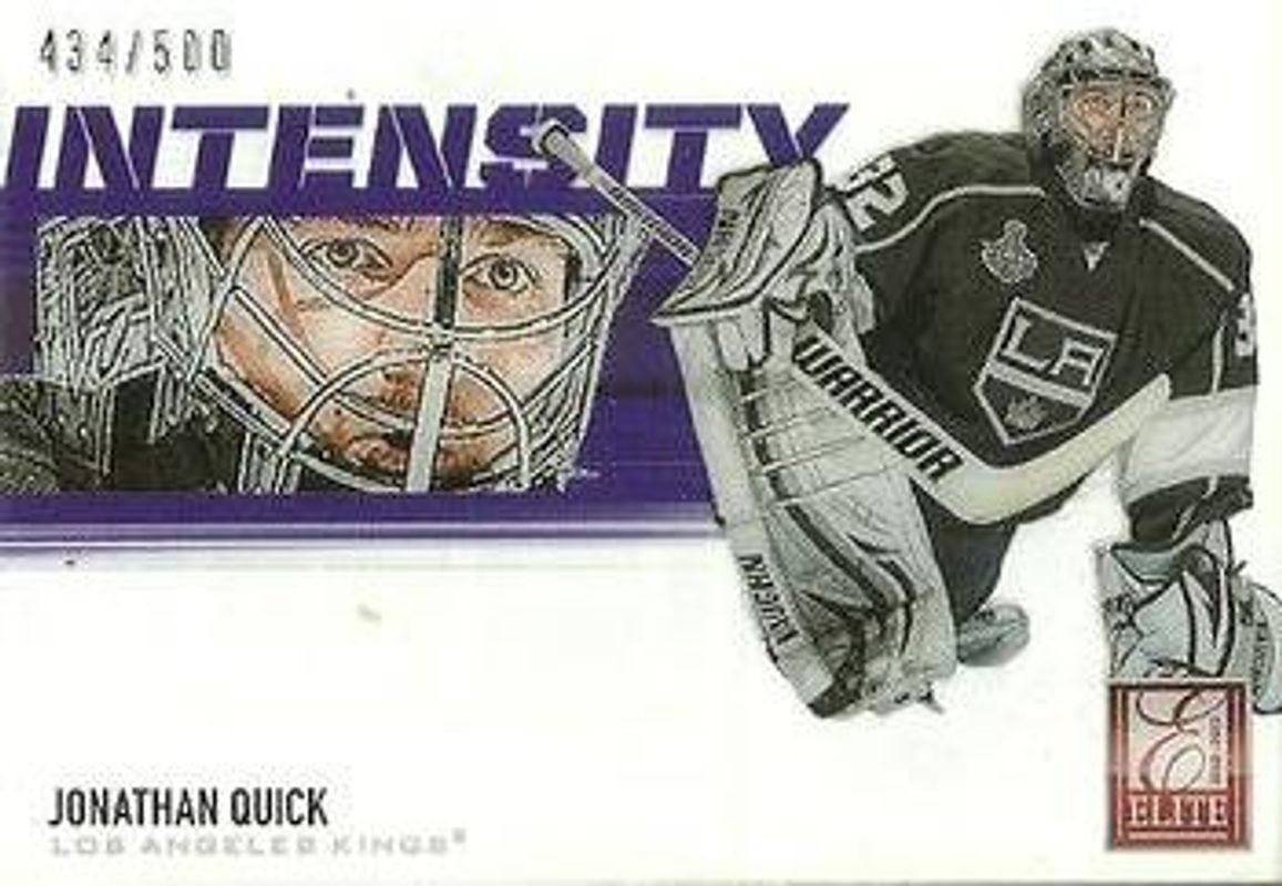 The Jonathan Quick 2012 Panini Rookie Anthology #I-7 Elite Intensity /500 card is 1 of 21 Jonathan Quick's card variations in the 2012 Panini Rookie Anthology set being tracked by Sports Card Investor, including Base /699, Printing Plates Black /1, Printing Plates Cyan /1, Printing Plates Magenta /1, and Printing Plates Yellow /1.