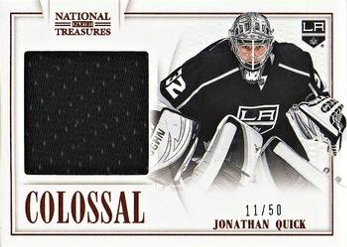 The Jonathan Quick 2013 National Treasures #CO-JQ Colossal Jerseys /50 card is 1 of 69 Jonathan Quick's card variations in the 2013 National Treasures set being tracked by Sports Card Investor, including Base /99, Gold /25, Silver /25, Emerald /5, and Black /1.