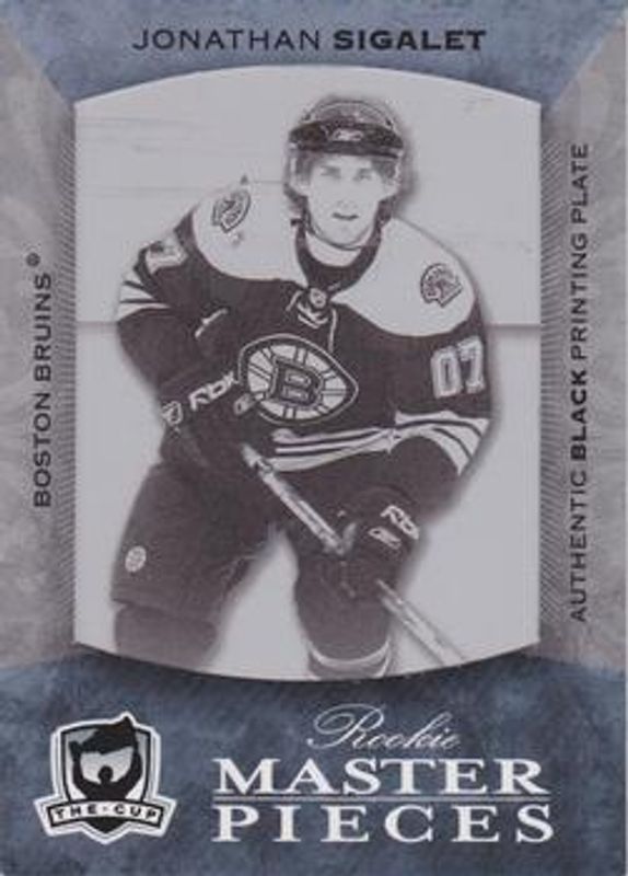 The Jonathan Sigalet 2007 Upper Deck The Cup #K-143 2007 Upper Deck Ice - Printing Plates Black /1 Rookie card is 1 of 49 Jonathan Sigalet's card variations in the 2007 Upper Deck The Cup set being tracked by Sports Card Investor, including Base /199, Gold /25, Black /1, Printing Plates Black /1, and Printing Plates Cyan /1.