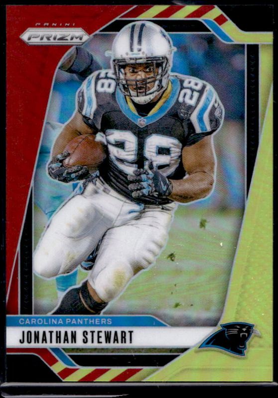 The Jonathan Stewart 2024 Prizm #45 Red & Yellow /44 card is 1 of 84 Jonathan Stewart's card variations in the 2024 Prizm set being tracked by Sports Card Investor, including Base, Choice Blue Yellow Green, Choice Silver, Disco, and Green.