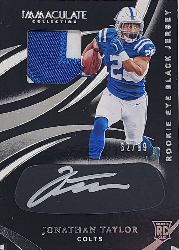 The Jonathan Taylor 2020 Immaculate #REB-10 Immaculate Rookie Eye Black Jersey Autographs (/99) card in Raw condition has not changed in price in the last 30 days and was last sold for $127.50 .