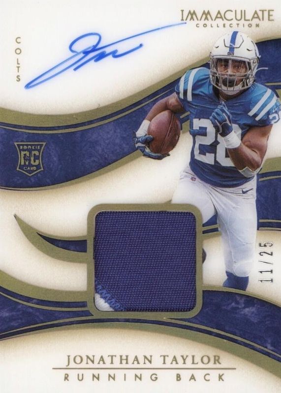 This card is 1 of 26 Jonathan Taylor's card variations in the 2020 Immaculate set being tracked by Sports Card Investor, including Immaculate Introductions Autographs (/25), Immaculate Numbers Rookie Patch Autographs (/28), Immaculate Rookie Eye Black Jersey Autographs (/99), Immaculate Rookie Shadowbox Signatures (/57), and Immaculate Rookie Signature Patches (/99).