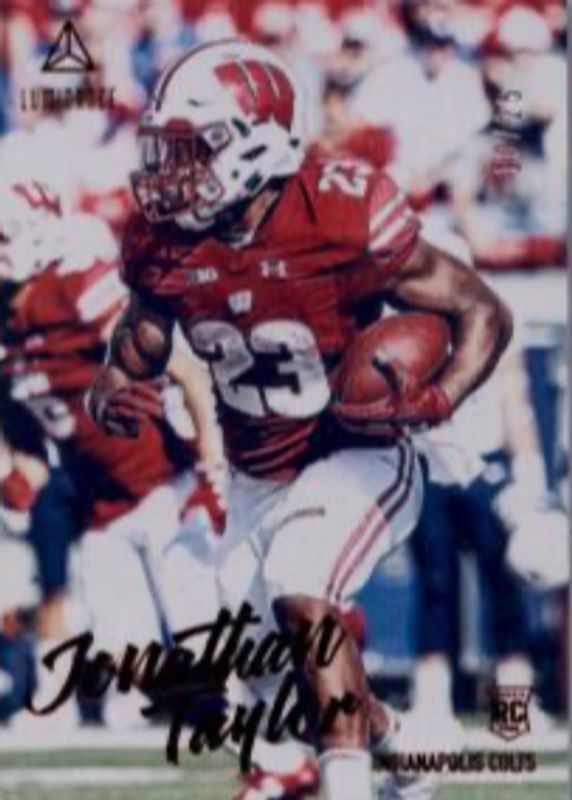 This card is 1 of 9 Jonathan Taylor's card variations in the 2020 Luminance set being tracked by Sports Card Investor, including Base, Gold (Rookie) /250, Blue /99, Green /75, and Orange /50.