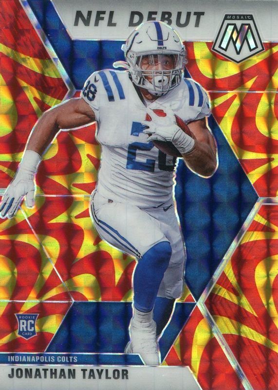 The Jonathan Taylor 2020 Mosaic #276 NFL Debut - Reactive Gold Rookie card in Raw condition has moved up $3.52 (+88.4%) in the last 30 days and was last sold for $7.50 .
