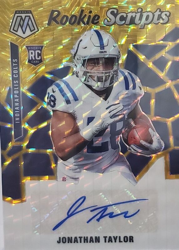 The Jonathan Taylor 2020 Mosaic #RS16 Rookie Scripts - Gold card in Raw condition has not changed in price in the last 30 days and was last sold for $207.50 .