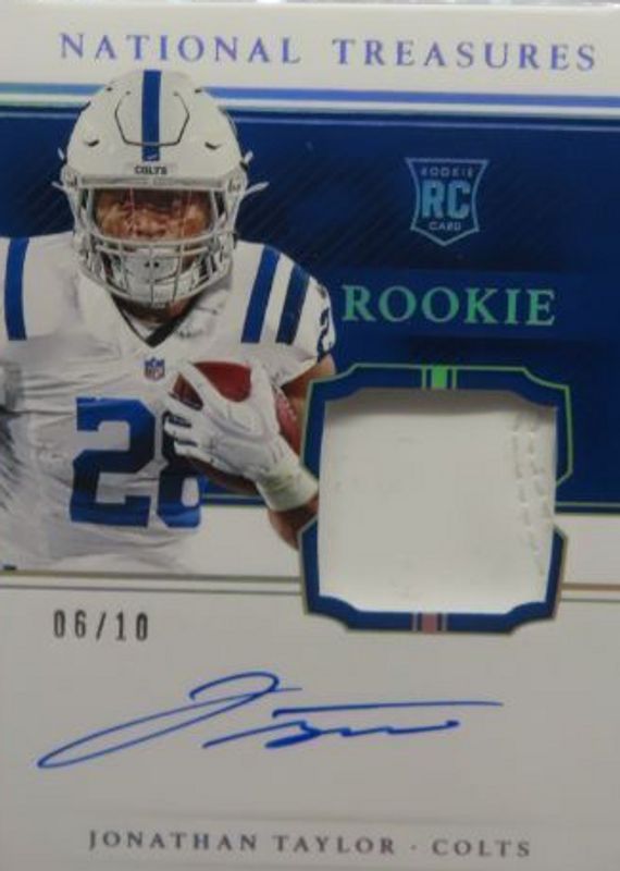 This card is 1 of 49 Jonathan Taylor's card variations in the 2020 National Treasures set being tracked by Sports Card Investor, including Rookie Patch Auto /99, Rookie Patch Auto - Green Jersey Number (/28), Rookie Patch Auto - Holo Silver /25, Rookie Patch Auto - Midnight /20, and Rookie Patch Auto - Stars & Stripes /20.