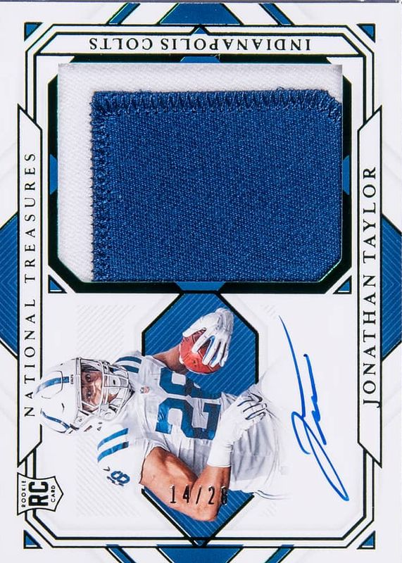 This card is 1 of 49 Jonathan Taylor's card variations in the 2020 National Treasures set being tracked by Sports Card Investor, including Rookie Patch Auto /99, Rookie Patch Auto - Green Jersey Number (/28), Rookie Patch Auto - Holo Silver /25, Rookie Patch Auto - Midnight /20, and Rookie Patch Auto - Stars & Stripes /20.