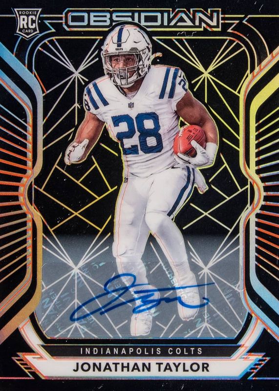 This card is 1 of 20 Jonathan Taylor's card variations in the 2020 Obsidian set being tracked by Sports Card Investor, including Rookie Autographs (/150), Rookie Autographs - Electric Etch Green (/50), Rookie Autographs - Electric Etch Red (/10), Rookie Autographs - Electric Etch Yellow (/25), and Rookie Jersey Autographs (/150).