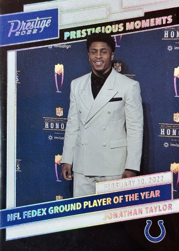 The Jonathan Taylor 2022 Prestige #PM-5 Prestigious Moments /(SSP) card in Raw condition has not changed in price in the last 30 days and was last sold for $8.00 .