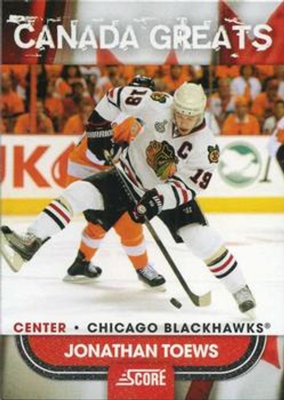The Jonathan Toews 2010 Score #2 Canada Greats card is 1 of 21 Jonathan Toews' card variations in the 2010 Score set being tracked by Sports Card Investor, including #16 Base, #500 Base, #32 Base, #31 Base, and #129 Base.