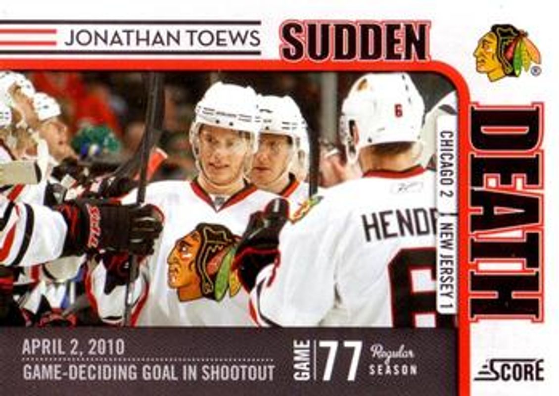 The Jonathan Toews 2010 Score #2 Sudden Death card is 1 of 21 Jonathan Toews' card variations in the 2010 Score set being tracked by Sports Card Investor, including #16 Base, #500 Base, #32 Base, #31 Base, and #129 Base.