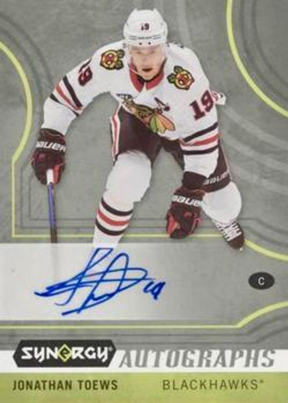 The Jonathan Toews 2019 Upper Deck Synergy #A-JO Autographs card is 1 of 5 Jonathan Toews' card variations in the 2019 Upper Deck Synergy set being tracked by Sports Card Investor, including Cast For Greatness, Cast For Greatness Black, Cast For Greatness Green Achievements /50, and Cast for Greatness Gold /10.