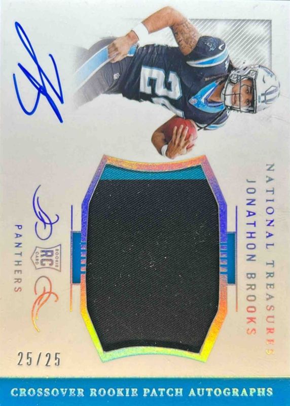 The Jonathon Brooks 2024 National Treasures #CRPA-JBS Crossover Rookie Patch Autographs - Holo Silver /25 card in Raw condition has not changed in price in the last 30 days and was last sold for $20.50 .