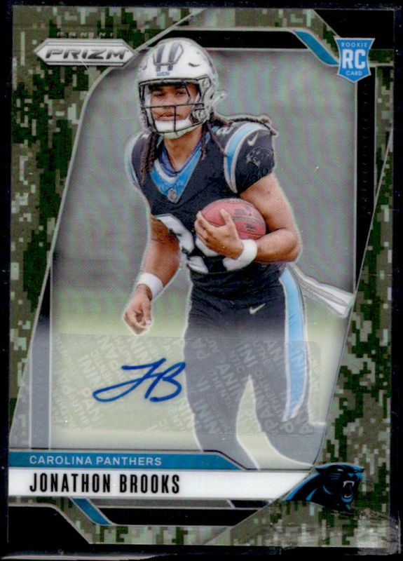 The Jonathon Brooks 2024 Prizm #357 Base Autographs - Camo /25 Rookie card is 1 of 138 Jonathon Brooks' card variations in the 2024 Prizm set being tracked by Sports Card Investor, including Base, Choice Blue Yellow Green, Choice Silver, Disco, and Green.