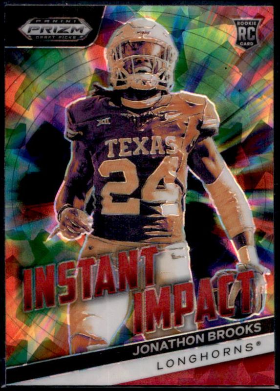 The Jonathon Brooks 2024 Prizm Draft Picks #II-JB Instant Impact - Red Ice Rookie card is 1 of 116 Jonathon Brooks' card variations in the 2024 Prizm Draft Picks set being tracked by Sports Card Investor, including Brilliance, Draft Picks Autographs, Draft Picks Autographs - Green, Draft Picks Autographs - Green Pulsar, and Draft Picks Autographs - Hyper.