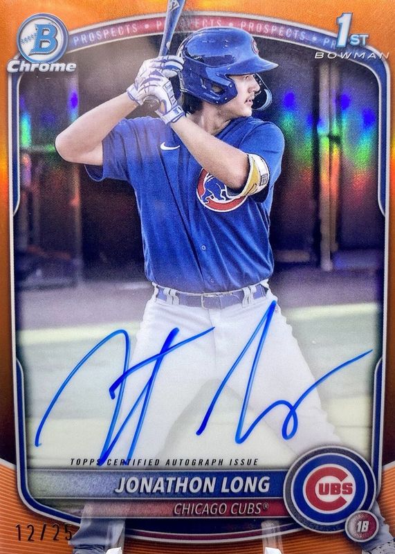 The Jonathon Long 2025 Bowman #CPA-JLG Chrome Prospect Auto - Orange Refractor /25 (1st) card in Raw condition has not changed in price in the last 30 days and was last sold for $356.00 .