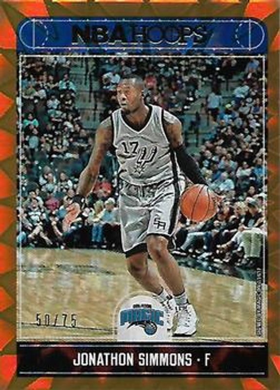 The Jonathon Simmons 2017 Hoops #198 Orange Explosion /75 card is 1 of 17 Jonathon Simmons' card variations in the 2017 Hoops set being tracked by Sports Card Investor, including Base, Premium Factory Set /199, Blue, Platinum, and Red Back.