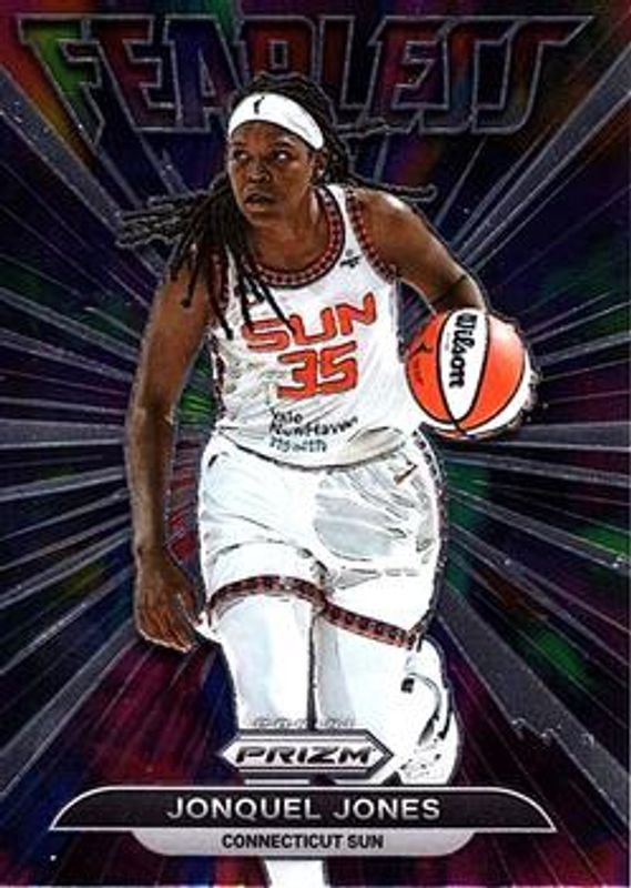 The Jonquel Jones 2022 Prizm WNBA #12 Fearless card is 1 of 64 Jonquel Jones' card variations in the 2022 Prizm WNBA set being tracked by Sports Card Investor, including Base, Green, Green Ice, Hyper, and Ice.
