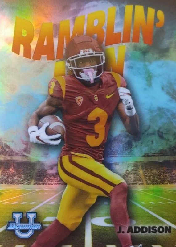 Best Prices Available For Sale of Jordan Addison 2022 Bowman Chrome University #RM-9 Ramblin' Man - Aqua Refractor /150