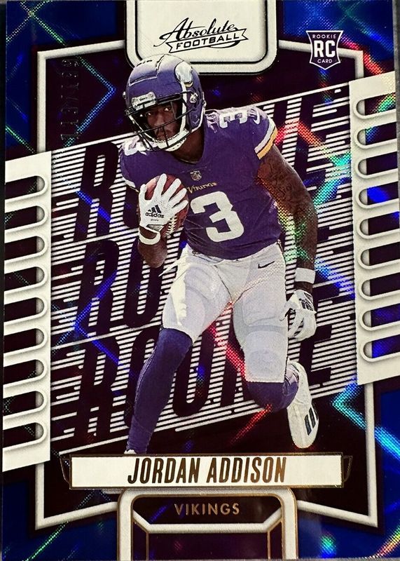 The Jordan Addison 2023 Absolute #112 Blue Diamonds /199 Rookie card in Raw condition has not changed in price in the last 30 days and was last sold for $10.39 .