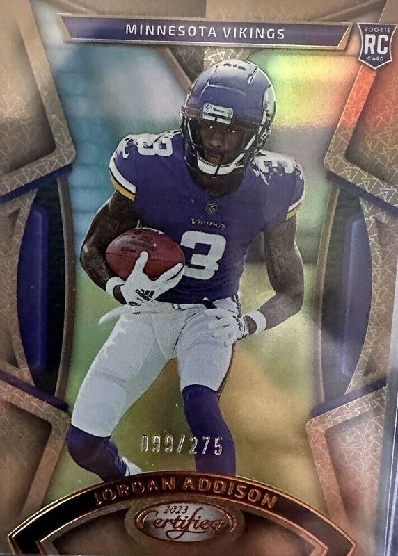 This card is 1 of 20 Jordan Addison's card variations in the 2023 Certified set being tracked by Sports Card Investor, including Base Rookie /399, Mirror /325, Mirror Pink /199, Mirror Orange /149, and Mirror Red /99.