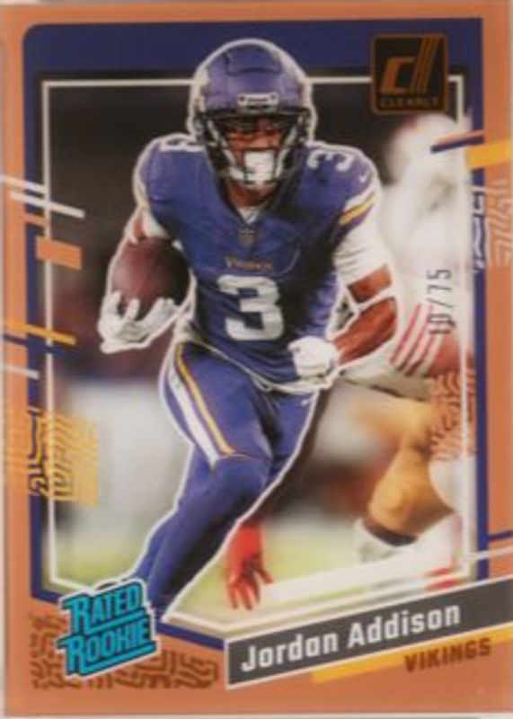 The Jordan Addison 2023 Clearly Donruss #70 Orange /75 Rookie card in Raw condition has not changed in price in the last 30 days and was last sold for $6.51 .
