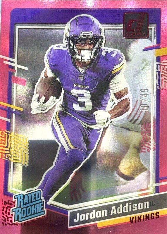 The Jordan Addison 2023 Clearly Donruss #70 Red /49 Rookie card in Raw condition has not changed in price in the last 30 days and was last sold for $10.50 .