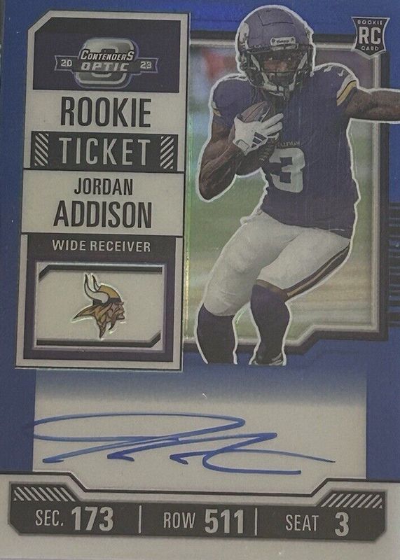 2023 Panini Contenders Optic Jordan Addison Rookie Ticket Auto Blue 55/75