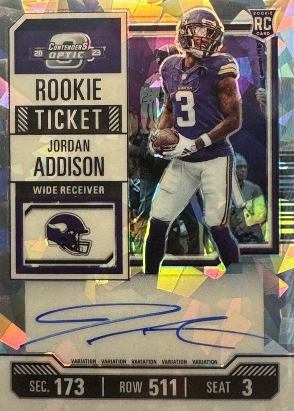This card is 1 of 51 Jordan Addison's card variations in the 2023 Contenders Optic set being tracked by Sports Card Investor, including Rookie of the Year Contenders Autographs - Blue (/45), Rookie Ticket Auto, Rookie Ticket Auto - Red (/125), Rookie Ticket Auto - Silver, and Rookie Ticket Auto Variation.