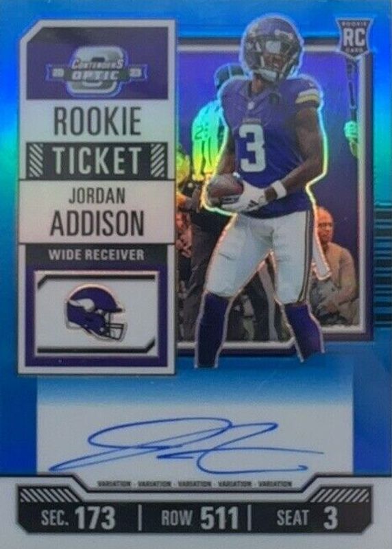 This card is 1 of 51 Jordan Addison's card variations in the 2023 Contenders Optic set being tracked by Sports Card Investor, including Rookie of the Year Contenders Autographs - Blue (/45), Rookie Ticket Auto, Rookie Ticket Auto - Red (/125), Rookie Ticket Auto - Silver, and Rookie Ticket Auto Variation.