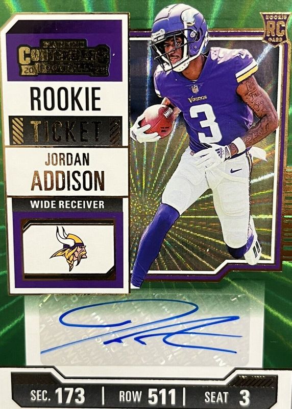 This card is 1 of 31 Jordan Addison's card variations in the 2023 Contenders set being tracked by Sports Card Investor, including Rookie Ticket Auto, Rookie Ticket Auto - Red Zone Ticket, Rookie Ticket Auto - Ticket Stub (/3), Rookie Ticket Auto Variation, and Rookie Ticket Auto Variation - Opening Kickoff Ticket.