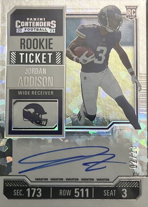 This card is 1 of 31 Jordan Addison's card variations in the 2023 Contenders set being tracked by Sports Card Investor, including Rookie Ticket Auto, Rookie Ticket Auto - Opening Kickoff Ticket, Rookie Ticket Auto - Red Zone Ticket, Rookie Ticket Auto - Ticket Stub (/3), and Rookie Ticket Auto Variation.