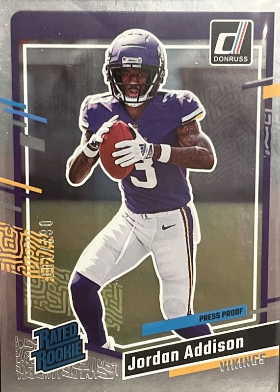 The Jordan Addison 2023 Donruss #368 Press Proof Silver /100 Rookie card in Raw condition has not changed in price in the last 30 days and was last sold for $14.00 .