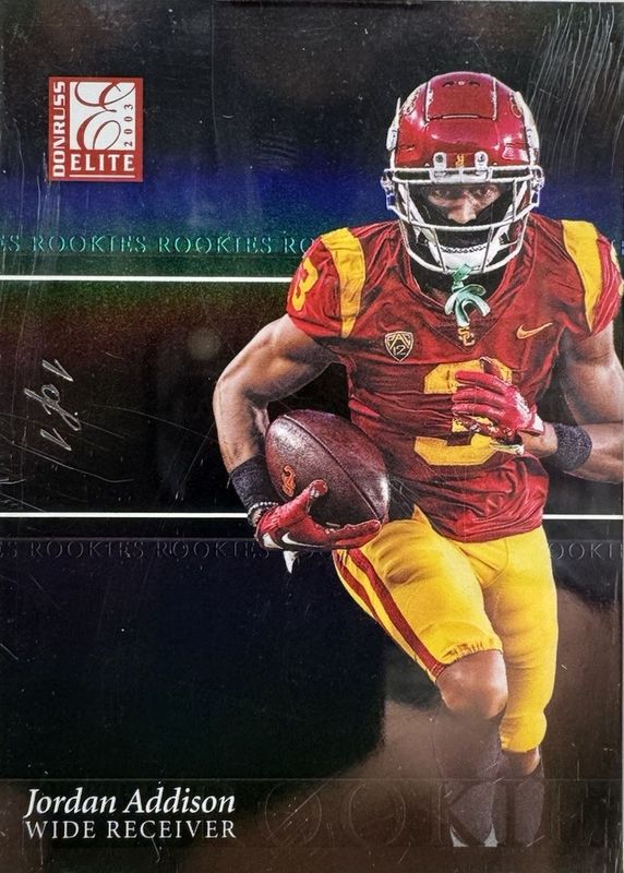 This card is 1 of 50 Jordan Addison's card variations in the 2023 Elite set being tracked by Sports Card Investor, including Base Rookie /999, Aspirations (/97), Green Disco, Pink, and Status (/3).